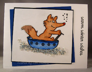 My next card is for the past Wednesday's sketch challenge on Splitcoast. It is a great sketch for a bit larger images!! I have been wanting to use this fun set from Treehouse Stamps, Sledding Fun Reminds me of when the boys were little and we would take them sledding!!! I colored the image with my Prismacolor Pencils, Gamsol and blending stumps. The base card and image are Papertrey White Select cardstock. The main image is attached to a small layer of Basic Black and then a layer of Brilliant Blue. I added some Treehouse Vanilla Ice Cream Chunky Glitter below the sled. I absolutely LOVE this chunky glitter, it is so fun and sparkly!! My final touch was to add Tan Fun Flock to his tail!! I decided to stamp the sentiment along the side, seemed to work best!! :)
