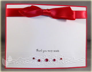 Anyway, onto today's card. A co-worker of mine asked me to make her a few thank you cards, I asked what colors and she said she likes bright pink. In looking through today's featured stamper, I found this card by jenndspencer I thought would work perfectly!! Congratulations Jenn!! I changed the colors, turned the sketch and changed the folder I used.