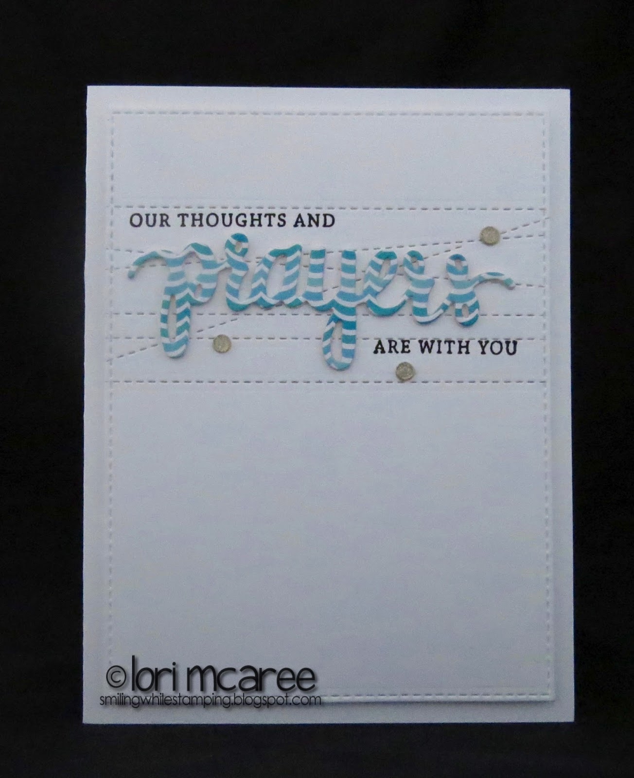Hi everyone! Today I have a card for this weeks CAS(E) this Sketch challenge. I knew what I wanted to do as soon as I saw the sketch. That doesn't happen very often lately! It was a quick card to make too!! I started out with my Die-Namics Stitched Strip, then I used my Hero Arts Prayers stamp set and dies to cut out the prayer. I cut it out 3 times for dimension, stamped the other two greetings using Versafine Onyx black in. I added a few random gems and the top panel is up on pop dots.